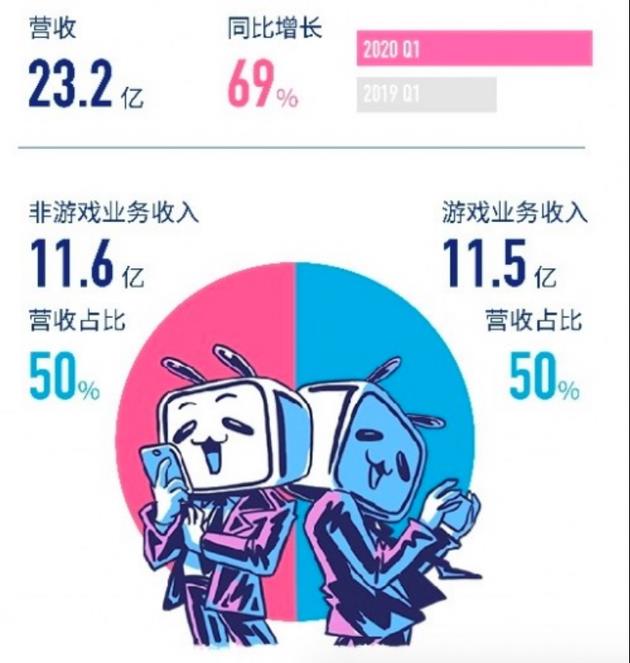 传统视频网站对广告营收的依赖程度远远高于B站,受冲击程度更大。爱奇艺在广告收入同比下降27%后,广告收入占总营收比例依然达到19.73%。而B站一季度的广告收入在同比增长90%后达到2.1亿,在23.2的总营收中仅占9%。据悉,B站的最主要营收来源为游戏收入,一季度其游戏收入为11.5亿,占比接近50%。