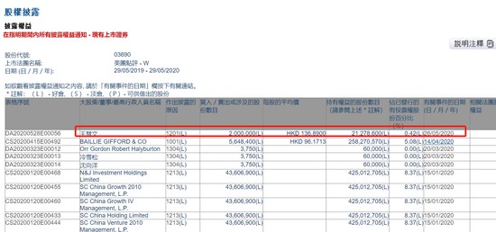 炣燃科技综合新浪港股讯 5月29日消息,根据港交所披露易,美团执行董事兼高级副总裁王慧文在5月26日(美团市值突破1000亿美元之际),减持200万股,平均价格为136.89港元,套现2.74亿港元,B股持股量降至0.42%。不过,公司股价依然涨逾2%,最新报价140.2港元,最新市值8169亿港元,折合1054亿美元。