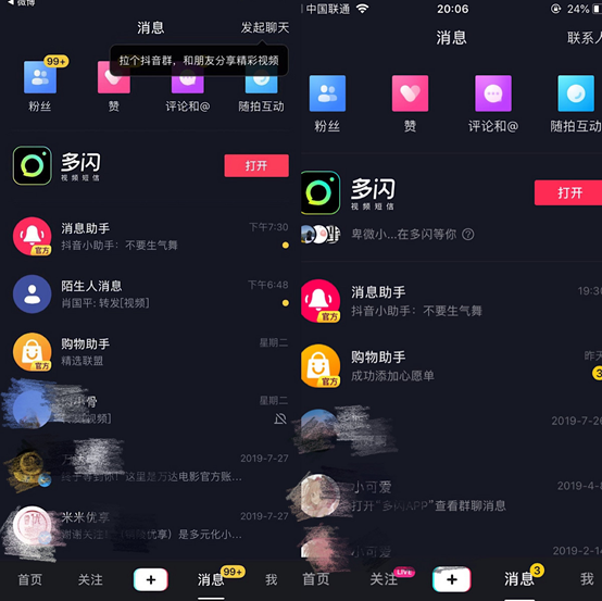 多闪、飞聊都是字节跳动获取社交流量沉淀用户的尝试,两个产品也在慢慢与其他产品融合(今日头条连接了飞聊,抖音连接了多闪),不过并未有太大起色。可以肯定的是,熟人社交产品之外,发起聊天随时沟通已经成为内容平台的一项重要功能。抖音的私信、群聊都是尝试,快手也早已支持群聊功能。