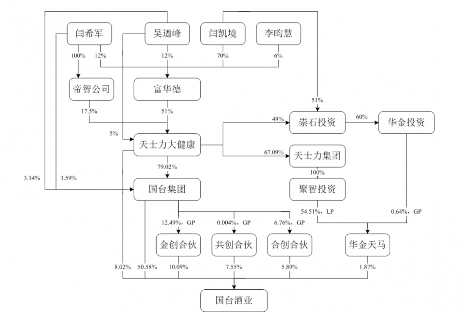 2018年2月,国台酒业进行第五次增资,引进金创合伙、共创合伙、合创合伙三家持股平台,这三家持股平台主要由国台酒业102家经销商的实际控制人、主要经营管理人员或亲属作为有限合伙人入伙。同时,粤强酒业出资240万元成为国台酒业的股东。同年4月,粤强酒业和共创合伙再次对国台酒业进行增资。