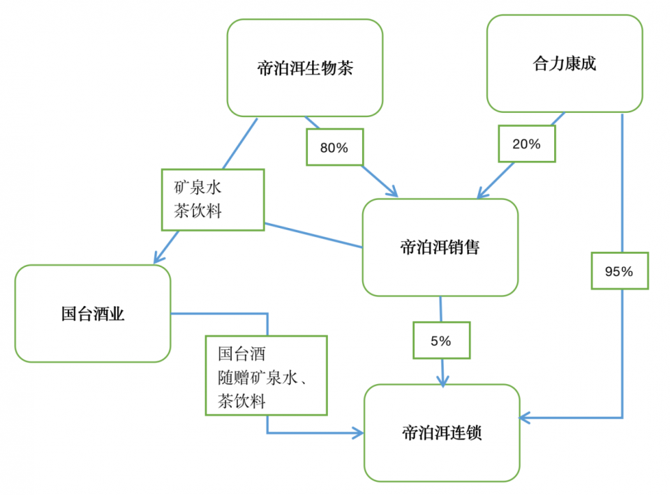 可以得见,国台酒业的这家关联经销商与自身董监高存在深度绑定的关系。不仅如此,国台酒业还向帝泊洱连锁的股东帝泊洱销售及云南天士力帝泊洱生物茶集团有限公司(以下简称“帝泊洱生物茶”)采购商品矿泉水及茶产品,报告期内交易金额分别为33.12万元、2.26万元、1053.46万元。天眼查数据显示,帝泊洱生物茶的第一大股东为天士力大健康,持有68.48%的股份。