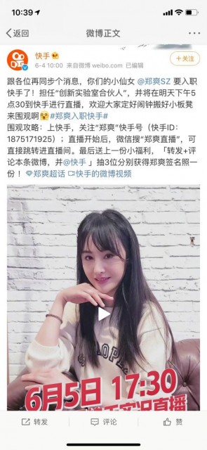 据了解,对待这次郑爽入职,快手方面也非常重视,不仅安排了扫楼,还特意准备了一场入职直播。根据官方披露,6月5日17:30直播开始,在微信搜“郑爽直播”四字,即可直接跳转到郑爽在快手的直播页面。