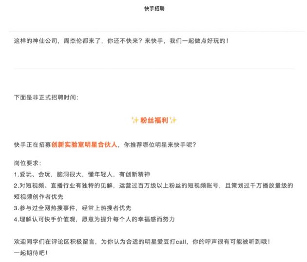 此前快手曾公开面向社会招聘“创新实验室明星合伙人”职位,要求包括“应聘者运营过百万级以上粉丝的短视频账号”、“参与过全网热搜事件,经常上热搜者优先”。以此来看,热搜体质的郑爽也算实至名归。