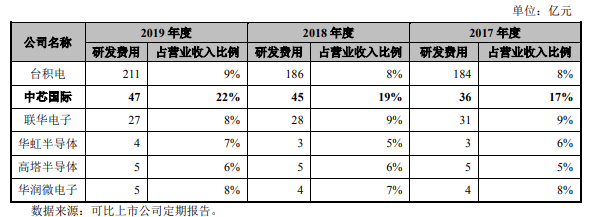据IPO招股报告书显示,在与竞争对手型公司进行比较时,中芯国际2019年度的研发费用为47亿元,尽管同全球第一的晶圆代工厂台积电相比较,只有其五分之一,但对中芯国际自身而言,却占据了全年营收的22%,同时也能发现,2017年至2019年,中芯国际的研发费用所占比例逐年升高。