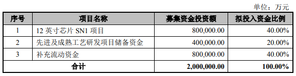 据招股说明书显示,本次初始发行的股票数量不超过168562.00万股(行驶超配额选择权之前),拟募集资金200亿元,主要用于12英寸芯片SN1项目(40%)、先进及成熟工艺研发项目储备资金(20%)和补充流动资金(40%)。