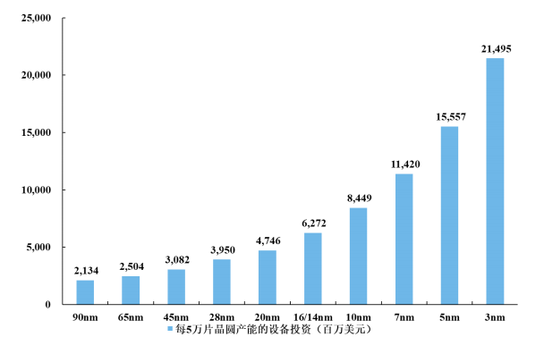 尽管从发展周期上看,中芯国际实现从28nm到14nm的时间周期同台积电相当,但是,台积电作为一家建立时间更早,规模更大的公司,相应有更多的人才和资金流向研发,在如此强大的竞争对手下,中芯国际能有这样的成绩,发展潜力巨大。但不得不正视的是,随着节点技术的不断缩小,集成电路制造所需的设备投入将大幅度上升。根据IBS统计显示,以5纳米技术节点为例,其投资成本高达数百亿美元,是14纳米的两倍以上,28纳米的四倍左右。与台积电营收差距巨大的中芯国际,将面临更大的挑战,这也正是此次上市的原因之一。
