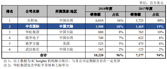 根据IC Insights公布的2018年纯晶圆代工行业全球市场销售额排名,中芯国际排名全球第4位,中国大陆第1位。台积电显然是中芯国际最大的竞争对手。