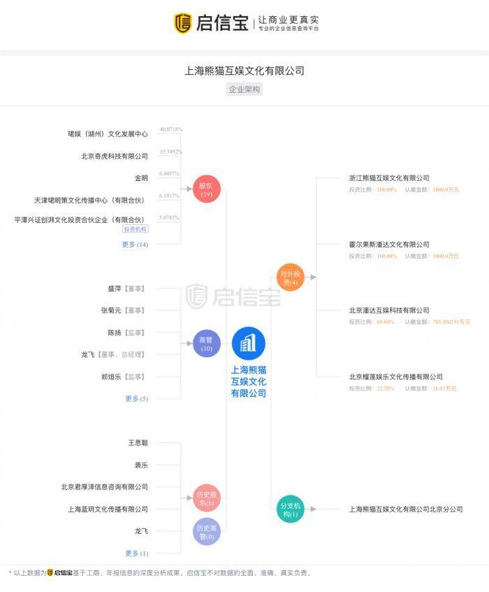据悉,上海熊猫互娱文化有限公司成立于2015年7月,公司注册资本约1.55亿人民币,公司经营范围包括文化艺术交流策划、赛事活动策划等,最终受益人为王思聪。启信宝数据显示,公司的最大股东为由王思聪全资持股的珺娱(湖州)文化发展中心,持股比例40.07%;周鸿祎旗下的北京奇虎科技有限公司则为第二大股东,持股比例19.35%。