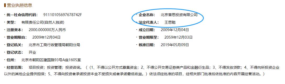 公开资料显示,北京普思投资有限公司成立于2009年12月,注册资本为2000万元,法定代表人为王思聪。根据股权结构,该公司由王思聪全资控股。