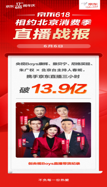 炣燃科技6月7日讯(江丞华)6月6日,京东直播公布了央视主持人康辉、撒贝宁、尼格买提、朱广权和北京电视台主持人春妮的直播战报,3小时销售13.9亿元,打破了“央视Boys”的带货记录,被外界称为最强直播天团。