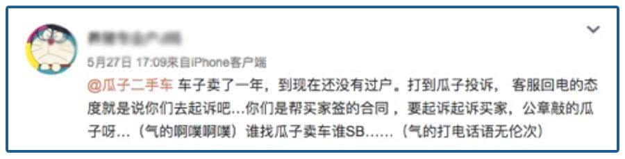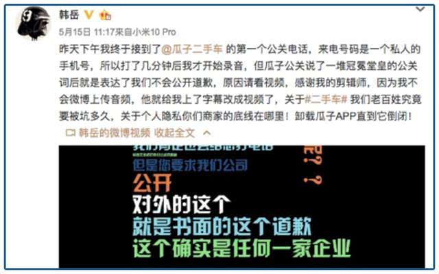 烦不胜烦的韩岳,将这事儿在微博上曝了光,他也收到了来自瓜子方面的公关电话,但韩岳关于公开道歉的要求还是被瓜子拒绝了,瓜子甩得一手好锅:泄露客户信息这事儿是整个“网络时代”的事儿,不仅是瓜子,你看所有的APP的客户信息都是透明化的。