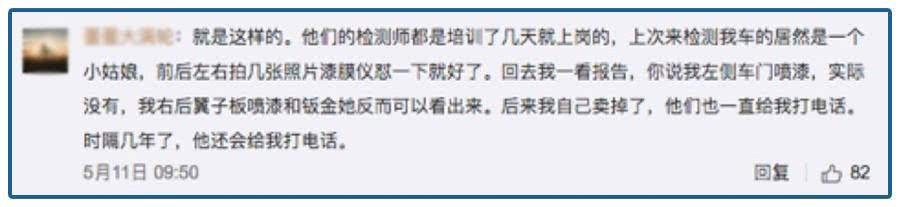 韩岳在他的卖车经历中,还透露了一个重要的信息,他的车曾左后侧补过漆,他自己都忘了,买他车的车商通过保单查出来的,但是在瓜子的验车记录里面,根本就没有这个信息。而在给韩岳的留言中,有人直言瓜子的验车师根本不专业。