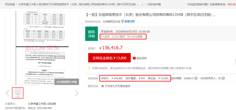 据了解,该拍卖是由北京市第三中级人民法院发起,所拍卖的乐视网持有的1354项商标(其中五项已注销)起拍价格为136416.7元。根据法院方面提供的相关评估报告显示,这些商标评估价格为194881元。