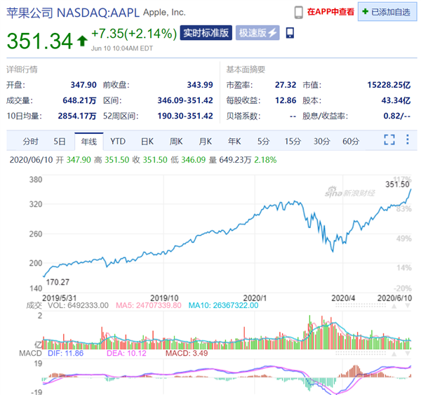 北京时间6月10日晚,美股开盘后,苹果股价持续走高,现已突破350美元,市值也历史性地突破1.5万亿美元!