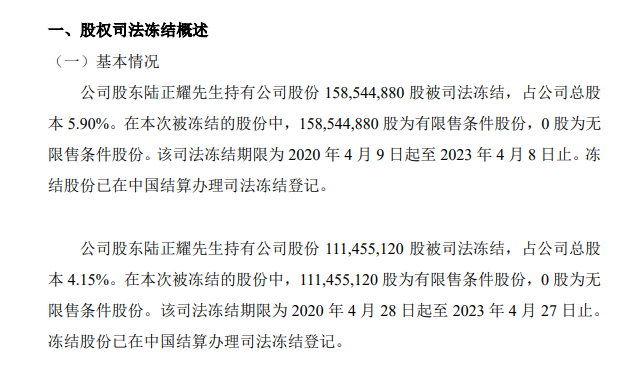 其中,陆正耀持有公司股份1.59亿股被司法冻结,占公司总股 本5.90%,均为有限售条件股份,该司法冻结期限为2020年4月9日起至2023年4月8日止;陆正耀持有公司股份1.11亿股被司法冻结,占公司总股本4.15%,均为有限售条件股份,该司法冻结期限为2020年4月28日起至2023年4月27日止。