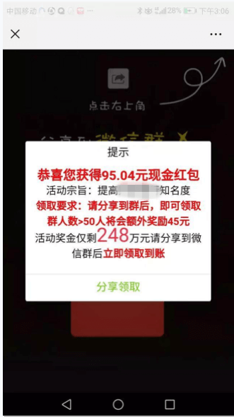 通过虚假的红包、活动等形式,以赚取金钱、实物奖品、虚拟奖品等方式欺骗用户参与的,具体形式包括但不限于虚假现金红包、虚假话费卡、虚假流量红包、虚假优惠券、虚假优惠活动等。