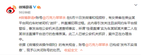 6月13日消息,微博辟谣官微发布声明表示,6月11日发微博和视频称有女乘客在乘坐某平台网约车时被司机“迷奸”并直播的账号@巧克力翠翠杀 已构成“发布不实信息”,现予以关闭账号的处罚。