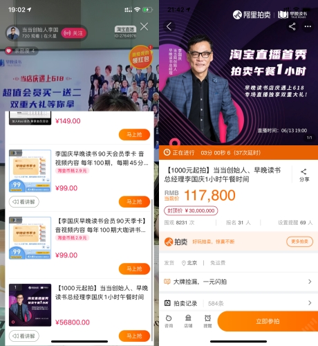 据《国际金融报》记者统计,此次直播主推的早晚读书99元季卡,最终销售额不足20万元,而原定于8点半结束拍卖的“李国庆午餐1小时”,在经过55次延时(延时周期2分/次)后,最终以12.94万元成交。