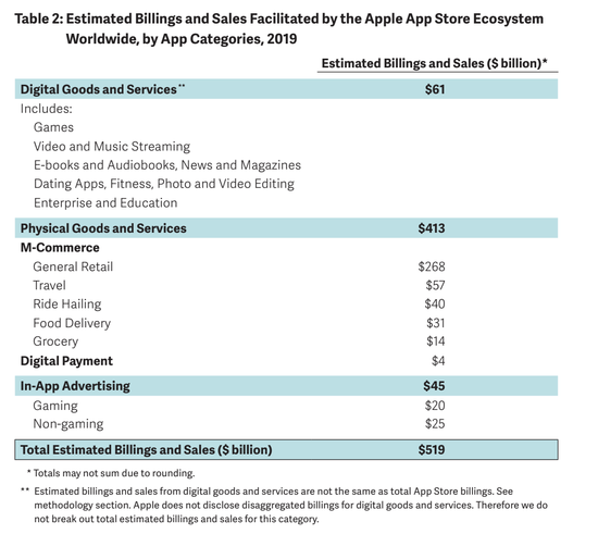 Analysis Group根据应用程序的使用比例来估计应用商店内外的销售额,这是因为直接账单是衡量所谓“多平台应用”总销售额的可靠指标。尽管这项研究没有涵盖受新冠疫情影响的时间段,但苹果指出,全球健康危机已经改变了人们使用设备的方式。