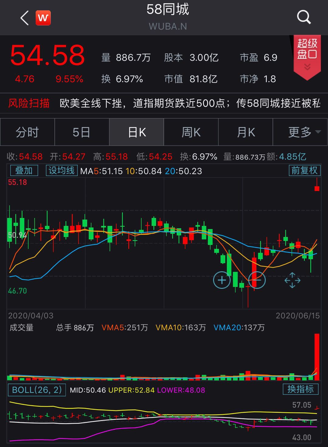 值得注意的是,与2020年4月1日(58同城宣布收到私有化要约的前一个交易日)58同城存托股收盘价相比,此次58同城私有化报价相当于溢价19.9%。受此影响,公司股价大幅拉升,截至6月16日收盘,存托股股价收报54.58美元/股,日涨幅达到9.55%。