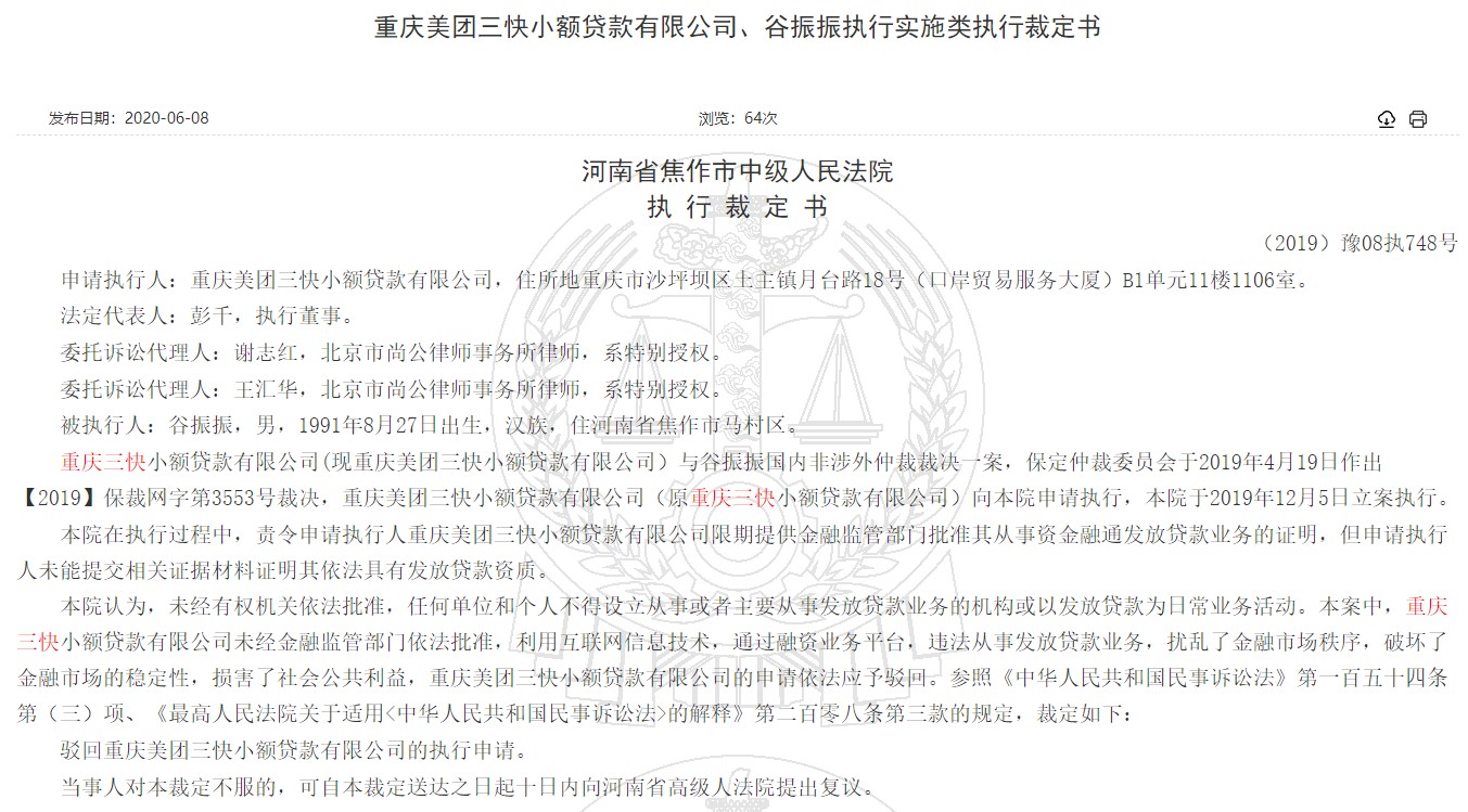 今年1月份,焦作中级法院还公布了另外一份裁定书,裁定书显示,2017年11月8日,美团小贷与自然人闪某通过美团点评借钱平台在网上签订《贷款合同》,合同约定:闪某向美团小贷进行“经营或流动资金周转需求”的分期借款,借款金额为80000元,借款期限为18个月,借款年利率18%,还款方式为等额本息。后闪某偿还本金3904.46元,剩余本金76095.54元及逾期违约金、利息未偿还。美团小贷于2019年4月1日向保定仲裁委员会申请仲裁,保定仲裁委员会于2019年4月19日作出(2019)保裁网字第3523号裁决书。2019年11月26日,美团小贷向焦作中级法院申请执行,焦作中级法院于同年12月2日立案执行。执行中,美团小贷未在指定期限内向法院提交证明出借人具有发放贷款资质的证据。法院同样认为,美团小贷未取得金融监管部门的批准,行为不具有合法性。