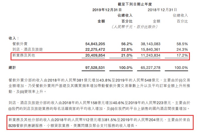 在2019年年报中,美团披露,2019年新业务及其他销售收入204.1亿,同比增长了81.5%,主要由于B2B餐饮供应链服务及小额贷款业务、美团闪购及聚合支付服务的收入增长。