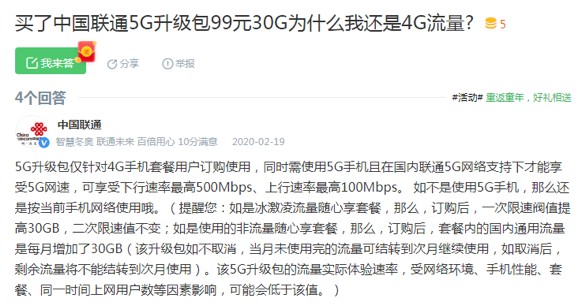 中国联通曾在百度知道回复过针对5G升级包的疑问,表示5G升级包仅针对4G手机套餐用户订购使用,同时需使用5G手机且在国内联通5G网络支持下才能享受5G网速,可享受下行速率最高500Mbps、上行速率最高100Mbps。如不是使用5G手机,那么还是按当前手机网络使用。这表明,联通客服所推销的“5G免费升级”为无稽之谈。