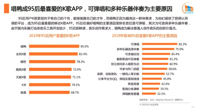 根据第三方数据研究机构比达咨询发布《2019年度95后用户K歌洞察报告》显示,2019年第四季度,中国在线K歌用户规模达2.82亿人,环比增长4.1%,其中95后已经成为主力用户群体。