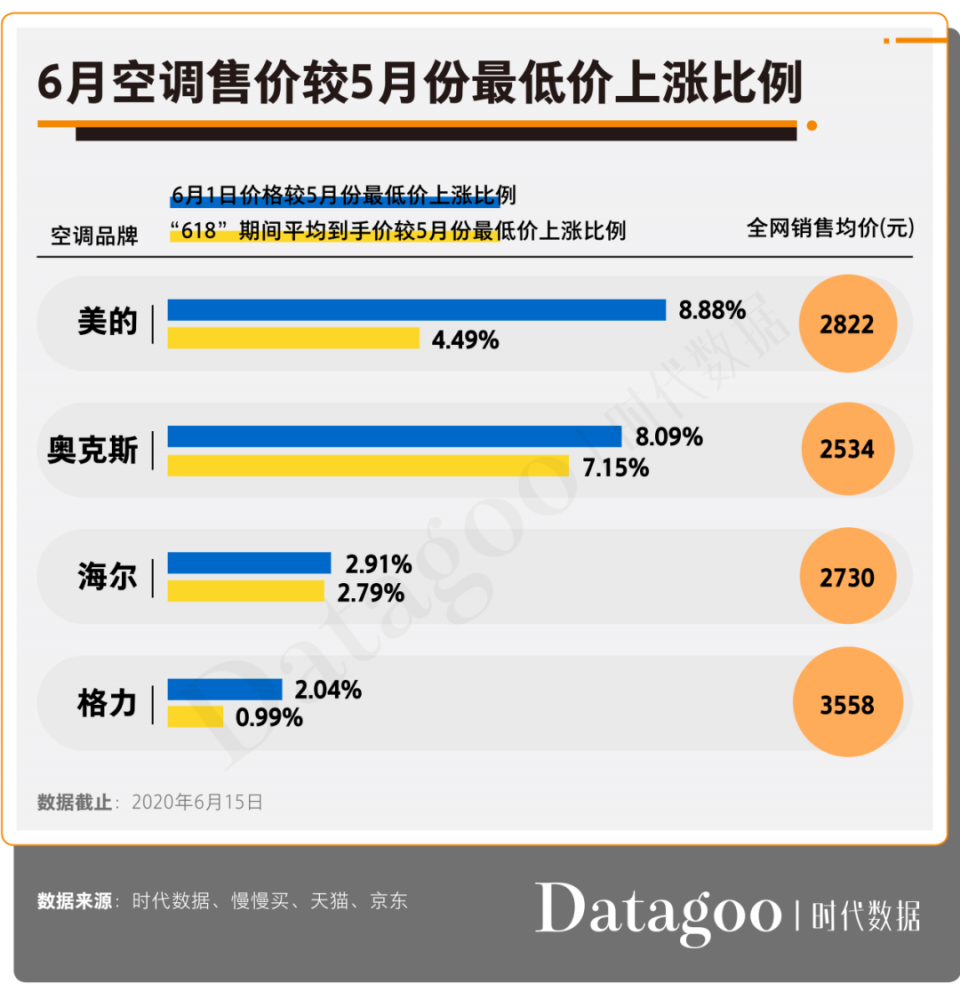 整体来看,截止2020年6月15日,在“618”期间,四大空调品牌旗下的主要空调产品平均到手价几乎都高于5月份最低价。其中,到手价较5月份最低价涨幅略小的是格力,涨幅最大的是奥克斯。值得注意的是,美的空调很明显的是先进行了大幅涨价,再进行较大幅度的降价促销。