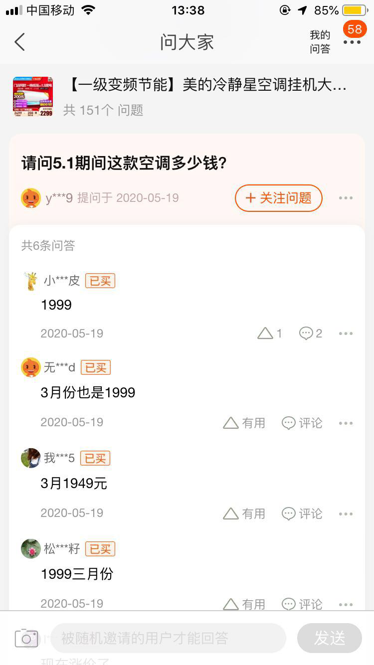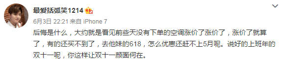 顿时,对急需空调续命的人来说,“618”已经失去了打折促销的意义。那些准备在“618”购置空调薅一把低价羊毛的消费者们也沦为了被薅的对象。