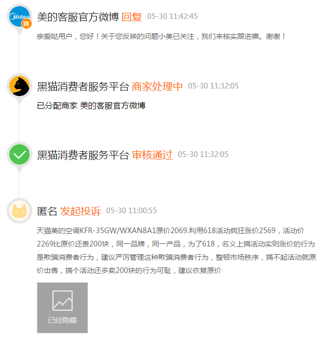 据黑猫投诉平台显示,有消费者于2020年5月30日在该平台投诉,称美的空调旗舰店利用“618”活动变相涨价。该名消费者表示,在售的美的KFR-35GW/WXDN8A1型号空调5月份的到手价是2069元,6月1日利用“618”活动疯狂涨价至2569元,后再进行减300元的优惠,最后6月1日的到手价变为2269元。同时,他还曾找商家理论,询问商家为何涨价,但商家态度很强硬,表示“不议价了”!