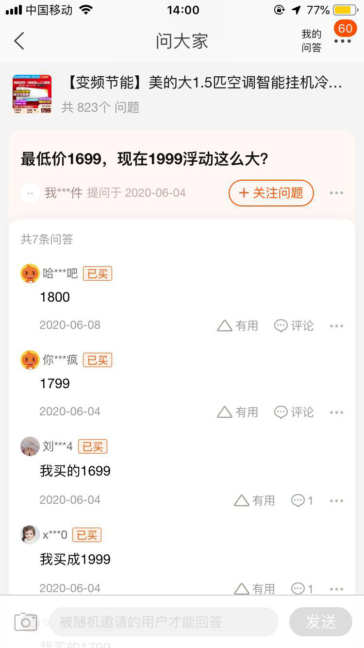 也有消费者反映,美的空调旗舰店目前最热销的机型“i青春大1.5p三级能效变频空调KFR-35GW/WCBN8A3@”也存在先涨价后降价的情况,5月份最低价为1699元,5月底调价到1999元,然后在6月1日开始“618”促销活动,产品价格调为1799元。