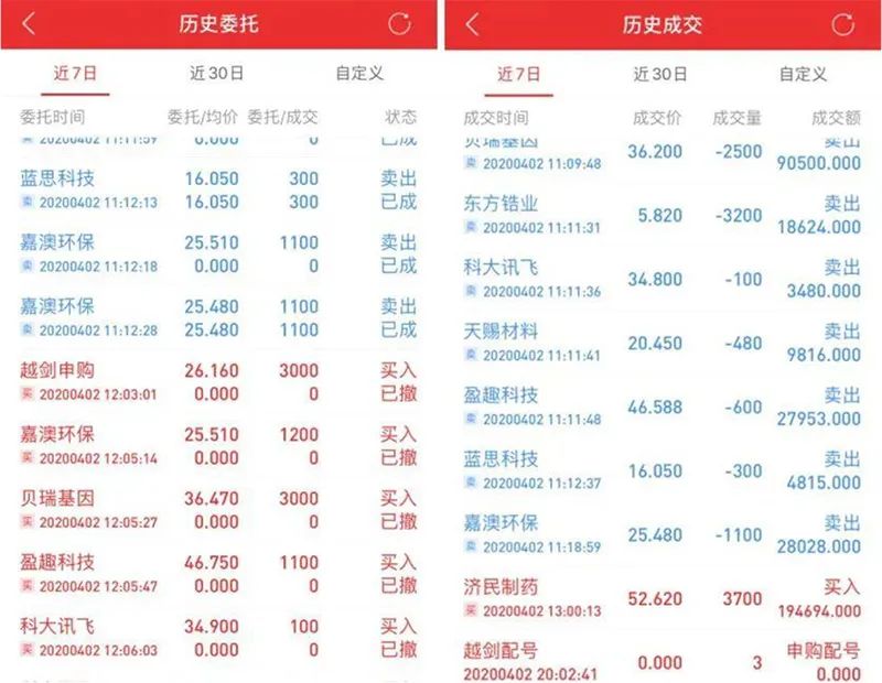 陈女士账户成交撤单截图