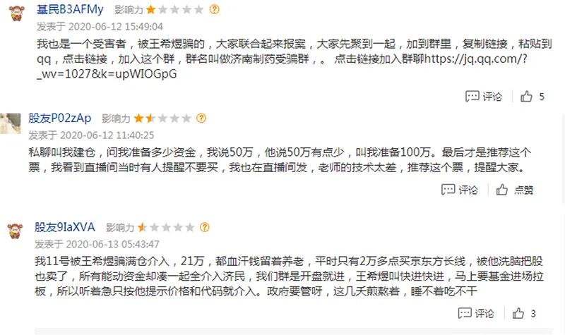 另外市场中还有大量投资者反映,自己通过网络直播间、微信群、QQ群等方式,接触到一些自称为股市高手的人,且都被忽悠买入济民制药股票,目前损失惨重。
