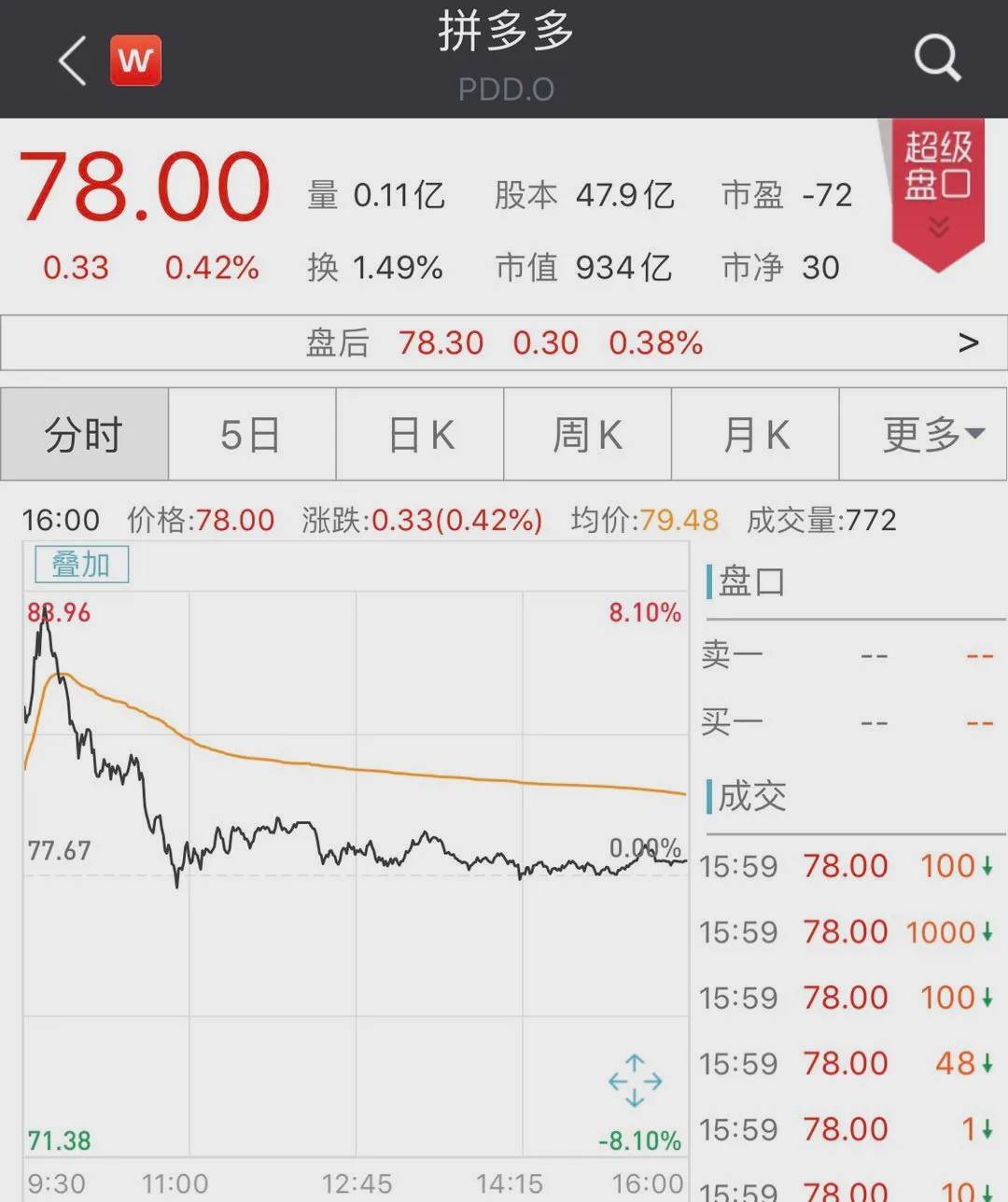 美东时间6月16日,拼多多一度大涨超7.5%,再次创出历史新高,总市值突破千亿美元。随后股价出现回落,截至收盘,拼多多报78.00美元,涨0.42%,总市值934亿美元。
