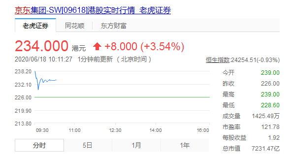 炣燃科技6月18日讯(江丞华)6月18日,京东集团正式在港交所挂牌上市,股票代码9618.HK。首个交易日,京东在港股价高开5.75%,盘前成交7.78亿港元。随后,涨幅略收窄,截至发稿时,公司股价涨3.54%,报234港元,其总市值7231.47亿港元。