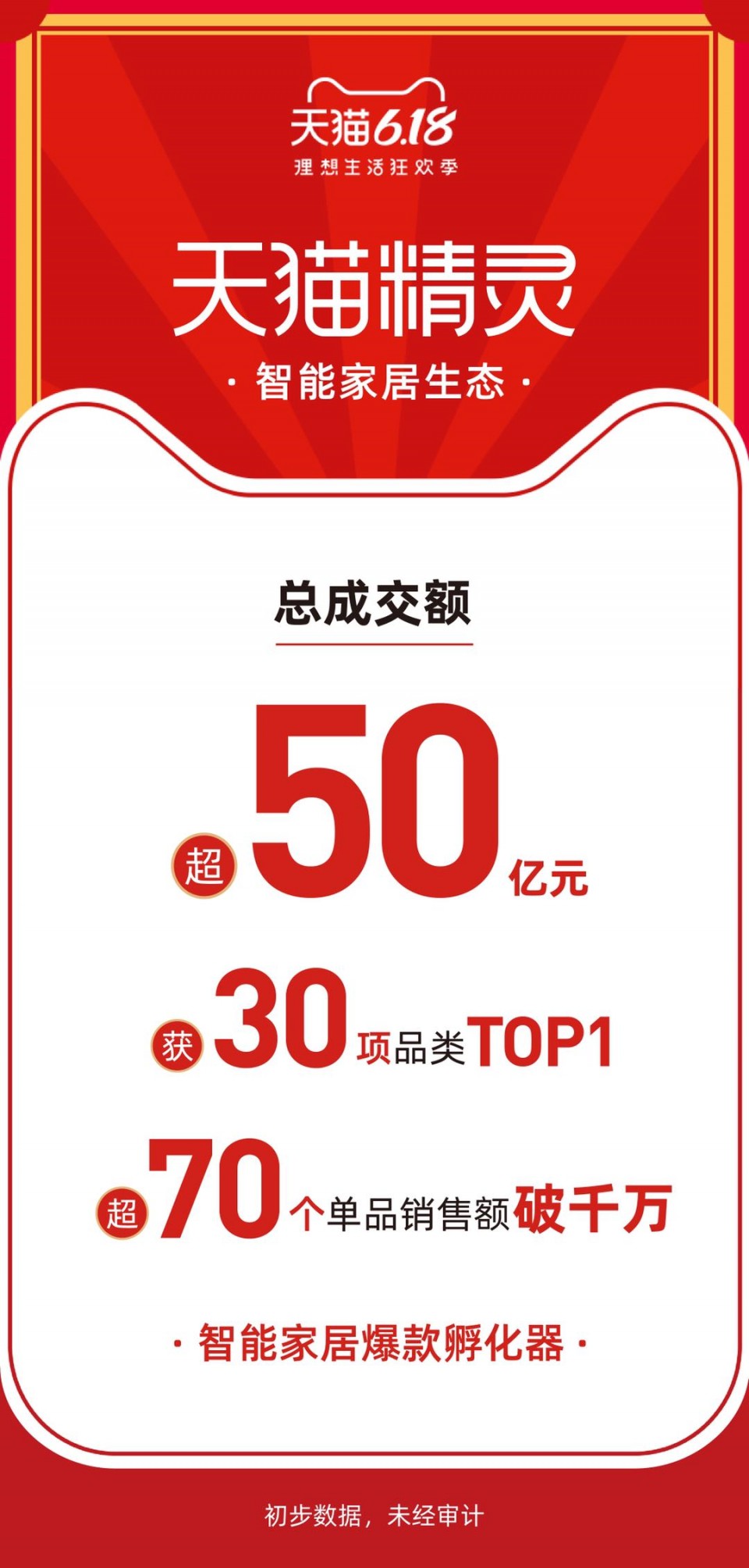 商业 天猫精灵智能家居公布618天猫平台总成交额 已超50亿元 2020-06-19 08:32:29 分享 来源: 网易科技6月19日消息,天猫精灵智能家居公布618天猫平台总成交额已超50亿元。截止6月18日24时,天猫精灵AIoT平台孵化爆款获30项品类TOP1,超过70个单品销售额破千万。其中,智能娱乐与智能健康板块,涨幅均超过300%,天猫精灵5月曾披露,其可连接设备数量达2.72亿台。该数量位列国内全行业第一。(彭丽慧)原标题:天猫精灵:618总成交额超50亿 超70个单品销售额破千万