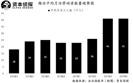 平台上劳动者人数是决定趣活业务水平的关键指标,从招股书披露的数据来看,这一指标在2019年下半年有较大幅度增长,平台劳动者突破4万人。招股书提到,以2019年平均月活跃劳动者数计,趣活是国内最大的劳动力运营解决方案平台。