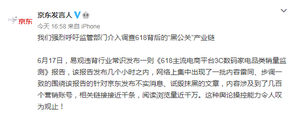 因此,京东强烈呼吁监管部门介入调查618背后的“黑公关”产业链。