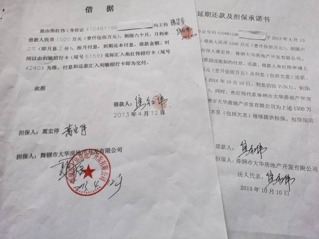 在舞钢市,她看了大华公司开发的房地产项目位置、规模以及销售情况后,认为完全放心可以把钱借给他们。张女士说,2013年4月12日,焦红伟作为借款人,大华公司当时的股东蒿宏停、王国福以及大华公司一起作为担保人,三人共同向“我和王伟”出具了借据。打印的“借据”上载明:王伟为出借人,刘敏(张爱真)为实际出借人(款项借出、收息收款均由我负责)。