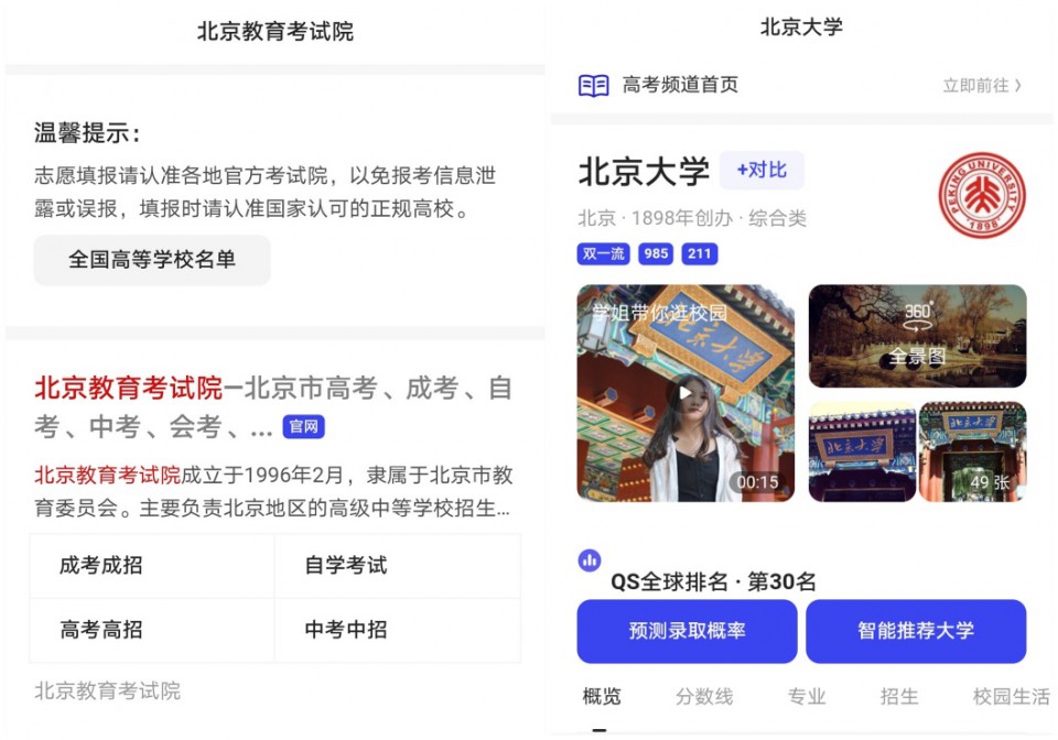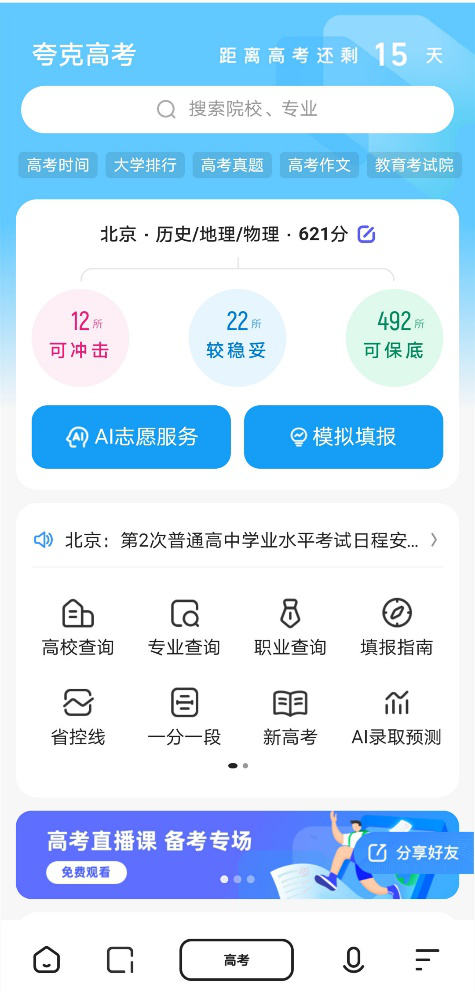 基于全面覆盖各大正规高校、专业、历年考分、录取结果等大数据,夸克搜索应用AI技术创新,不仅聚合专业、权威的各类高考信息资讯,升级院校、专业、职业、备考技巧等搜索结果,还重点打造了AI录取预测、智能匹配大学、模拟填志愿等便捷工具,在夸克首页搜索“高考”,即可进入“高考频道”。