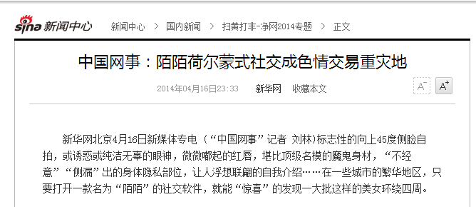 文章直言:“陌陌”等基于地理位置的陌生人之间交友软件的盛行不仅给色情交易等违法行为提供了新的“移动基地”,并且催生大量性侵案件的发生。