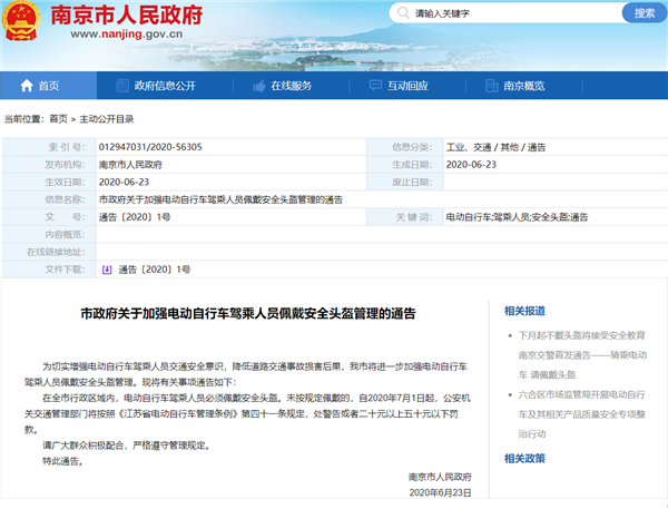 为切实增强电动自行车驾乘人员交通安全意识,降低道路交通事故损害后果,南京市将进一步加强电动自行车驾乘人员佩戴安全头盔管理。日前,我们从南京市人民政府网站获悉,7月1日起,全市行政区域内,电动自行车驾乘人员必须佩戴安全头盔
