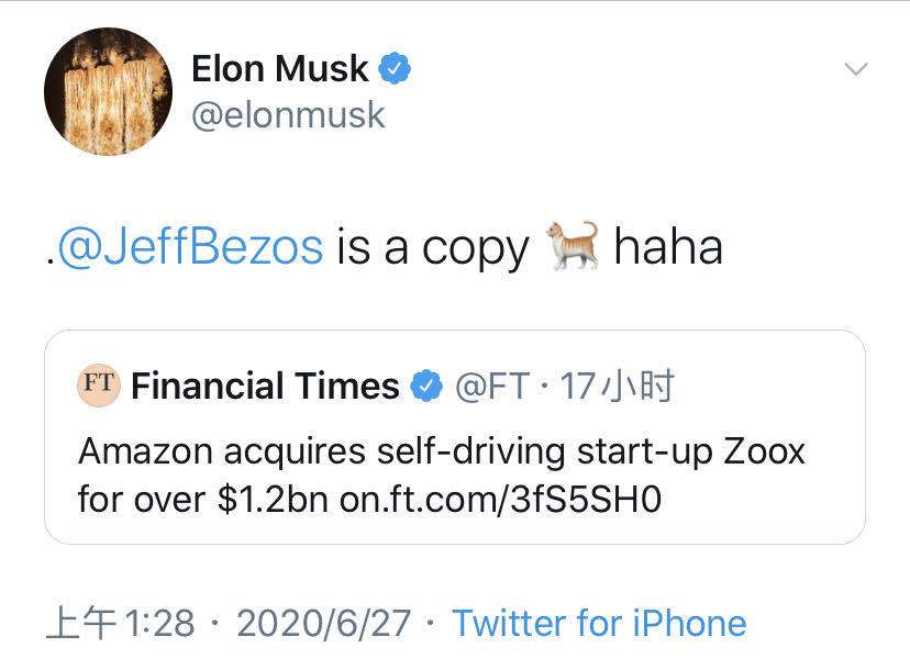 6月27日消息,据国外媒体报道,在美国电商亚马逊宣布收购自动驾驶初创公司Zoox后,当地时间周五美国电动汽车制造商特斯拉首席执行官埃隆·马斯克在Twitter上称亚马逊首席执行官杰夫·贝索斯(Jeff Bezos)是“抄袭者”。(网易编辑注:原文是copy cat,而在中文互联网中,比较热门的表达是"抄袭狗"。)