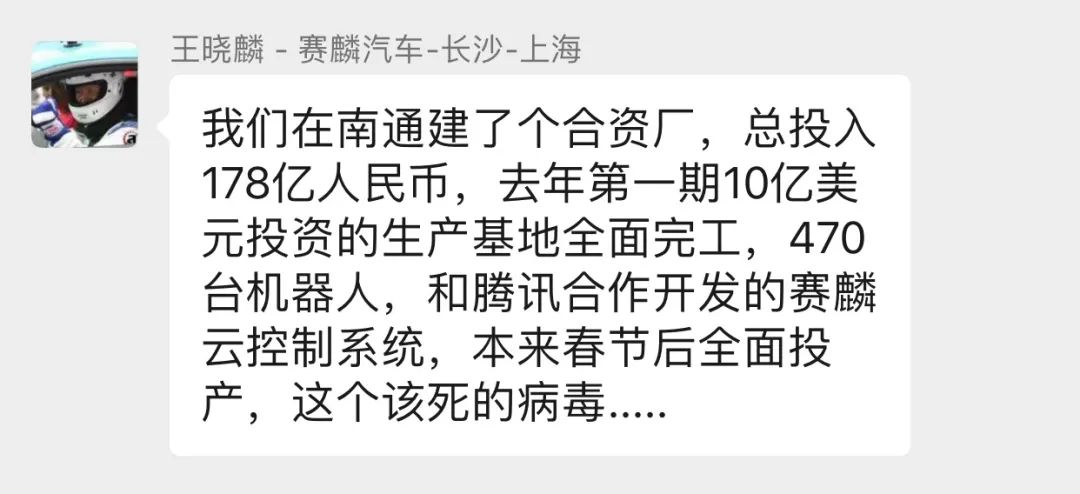 创业邦独家获悉,在今年初时,赛麟汽车董事长王晓麟在微信群中表示,“我们在南通建了个合资厂,总投入178亿人民币,去年第一期10亿美元投资的生产基地全面完工,470台机器人,和腾讯合作开发的赛麟云控制系统,本来春节后全面投产。”