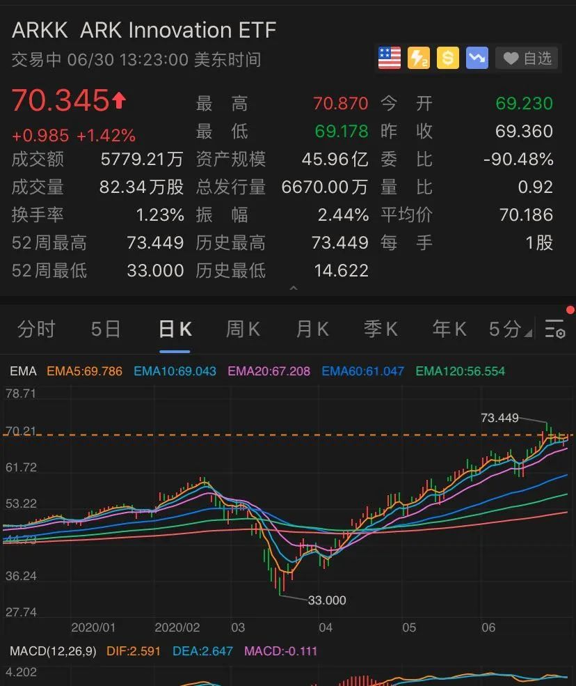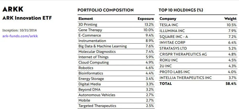特斯拉不断创新高的同时,以重仓特斯拉而知名的Ark Innovation ETF(ARKK)基金在今年也创下了超40%的收益。