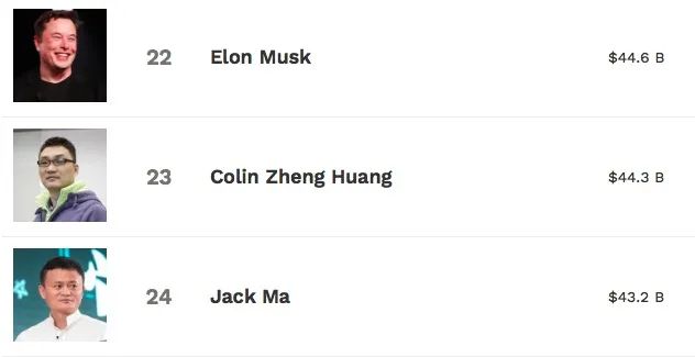 截至美东时间6月29日下午5点,马斯克身家为446亿美金,而黄峥和马云的身家分别为443亿美金和432亿美金。