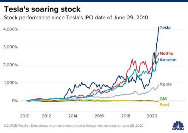 据CNBC测算,特斯拉十年来的涨幅超过了奈非、亚马逊、苹果这三支科技牛股。传统车企通用、福特近十年的股价涨幅表现平平,被特斯拉远远甩在身后。