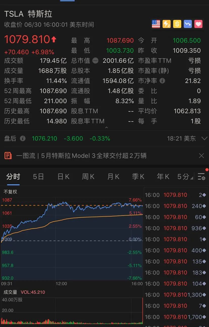 昨夜,特斯拉在美上涨6.98%,创下历史新高,收盘市值突破2000亿美金。