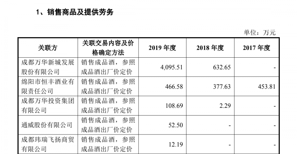 凤凰网财经注意到,郎酒股份与汪氏家族关联交易频繁。报告期内,郎酒股份不仅向汪俊刚控制的成都万华新城发展股份有限公司销售成品酒,还向其采购餐饮住宿及会议费等服务。